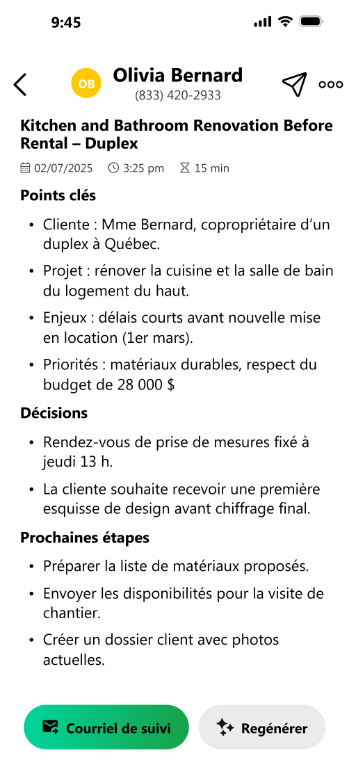 Avec VoxNote, chaque appel téléphonique devient un résumé de vente clair avec points clés et prochaines étapes. Besoin d'envoyer un suivi écrit? Un seul tap génère votre courriel.